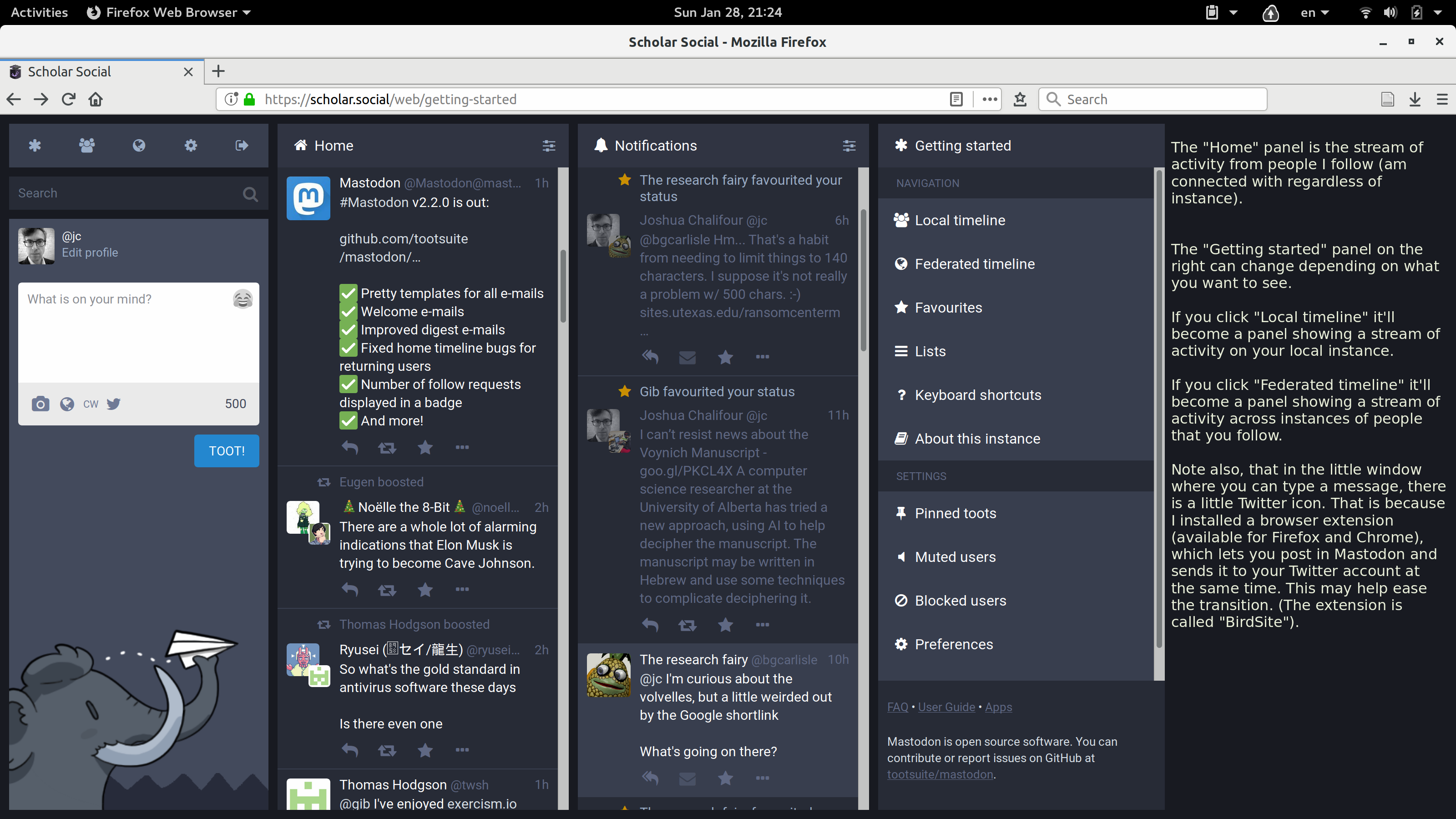 A tip for getting started: put some initial time and effort into searching for people to follow on Mastodon networks. Look at their followers/people they follow and connect to some. This will start populating your stream with activity to make it interesting and useful.